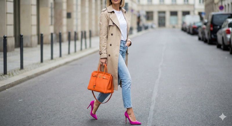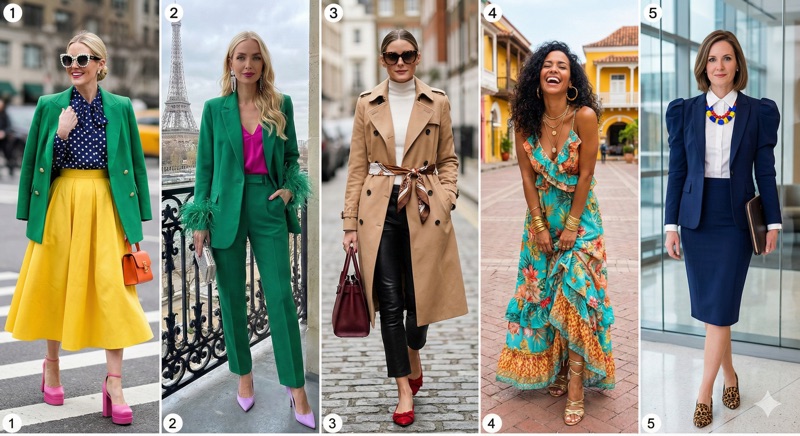 • Por que funciona: A "base" do look é segura. As cores ficam só nos detalhes, mostrando que você tem informação de moda, mas sem arriscar muito.
